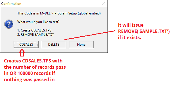 In my MyDLL > Global Embeds > Program Setup I am calling a procedure called TestDelete. This function will look for a file called SAMPLE.TXT and try to delete it using REMOVE(‘SAMPLE.TXT’). If the Remove command issued, it will hang the application.