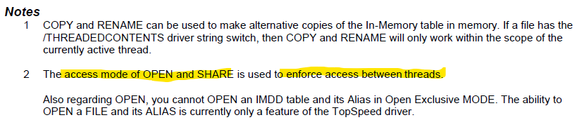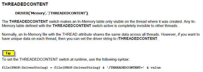 Then you could set templates to always Open(,12h) exclusive so EMPTY would work. You specify /THREADEDCONTENT i.e. DRIVER('Memory', '/THREADEDCONTENT’) and each thread gets its own instance.