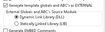 In your screen-shot above, “Generate template globals and ABC’s as External” should be ON in all but one of the DLL’s. In one DLL, let’s call this the “root dll” this option should be OFF. And then this “root DLL” is added as an External DLL Module to “all the other apps”.