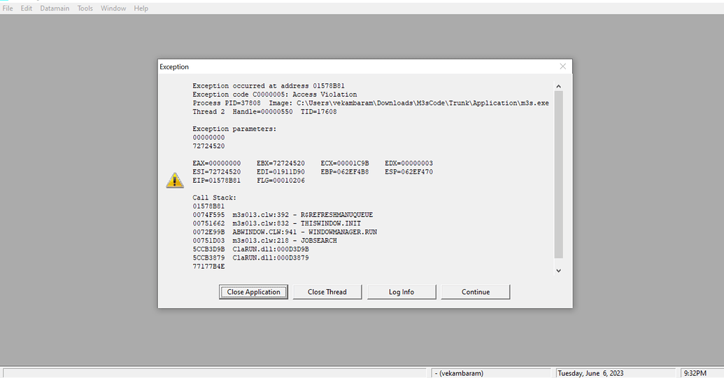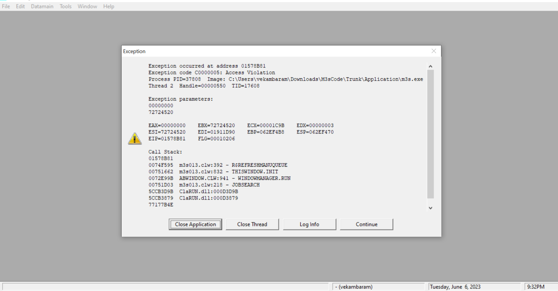 I’m getting the below access violation error. Is this related to any database connectivity or permission issue? I tried looking into the CLW file for the particular line below is the code which is pointing to.