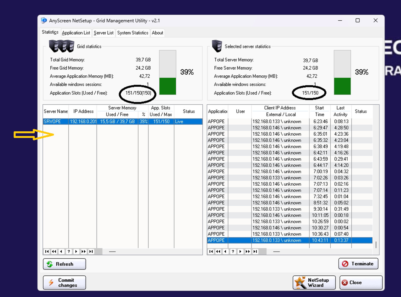 I have a question, in case someone who uses Anyscreen can answer. I have a local mobile app and all 150 devices available in NetSetup on the server in the image are already in use, so there was a need to add more devices. This computer has an extra network card, so I would like to know if I can create another server, with two registered (SRVOPE and SRVOPE2), each linked to a distinct local IP, and thus free up another 150 slots on this second server on the same computer. Is it possible to do this?