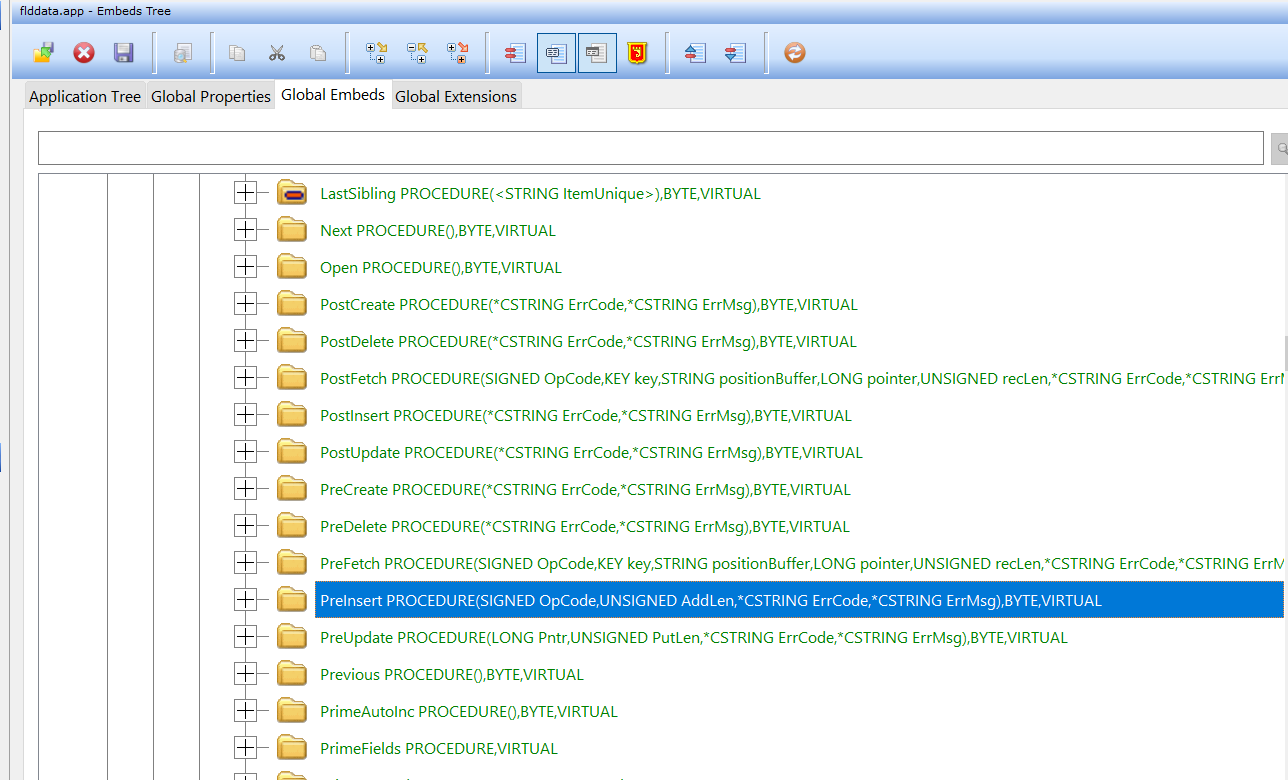 In the Global Embeds of your “data” DLL for a multi-DLL solution or in the Global Embeds of your EXE for a single EXE solution, open the Global Objects → ABC Objects → File Managers branch. You will see all of the tables in your dictionary’s file manager objects listed.