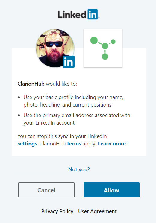 Just added to ClarionHub is the ability to create a new account or log in to an existing one using your LinkedIn credentials via super duper OAuth 2.0. Go tell your friends!