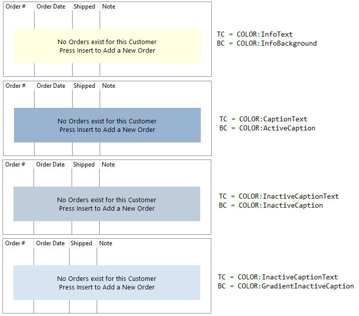 Some System Color examples are below that will change with the user’s color theme so these colors should work better with things like dark themes. Top one is making the message look like a Tool Tip aka Info Text.
