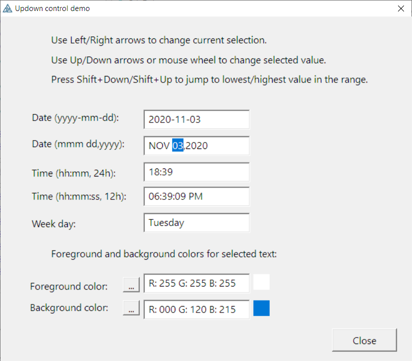 For example, if Updown control contains DATE value, say “NOV 03,2020”, a user can scroll months, days and years separately.