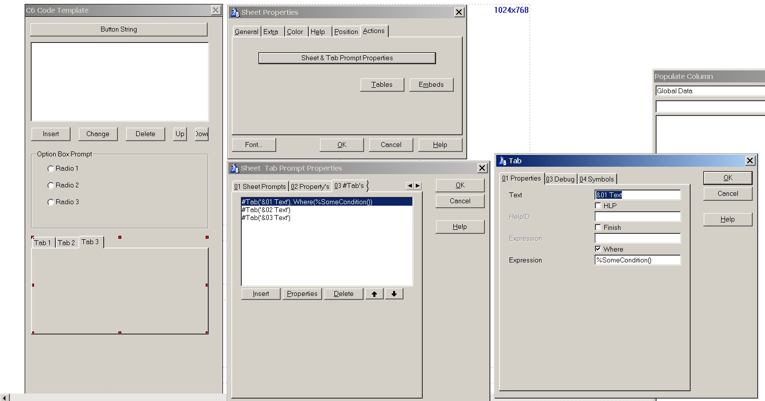 Like the Option box with Radio buttons, drop the #Sheet control on screen then add as many tabs you want using the standard window formatter tab control and the same number will be mirrored in this list for you automatically when click on the Sheet button found on the action tab. And then you can define the tab as you wish. The observant will note the procedure and parameter calling facility is missing from the Expression section. I’ve spotted a bug!