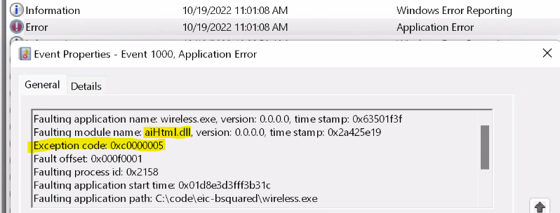 Edit: Event Viewer did log an Application Error 0xC0000005 for aiHtml.DLL so will look into getting a newer DLL: