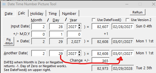 These screen caps are from my Date Time Tool that lets you test Clarion Date functions without writing code. It shows 2027 is not a Leap Year (2/29/27 formats as 3/1) but 365 days later in 2028 it is because Date(2,29,2028) run thru Format() returns Date 2/29