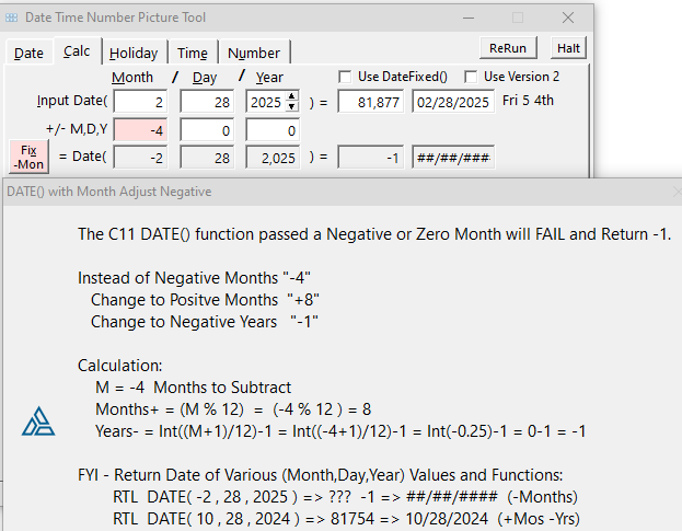 The current DATE() function cannot handle Negative Months, it will return -1. My Date Tool helps write the code to instead Subtract Years and Add Months.