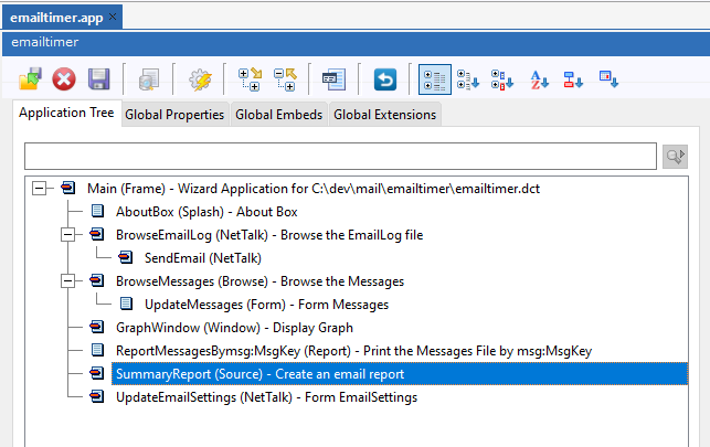 The highlighted procedure “SummaryReport” is routinely called by the Timer event on the Main module, at 10pm. It can also be called by clicking on a button on the main toolbar.