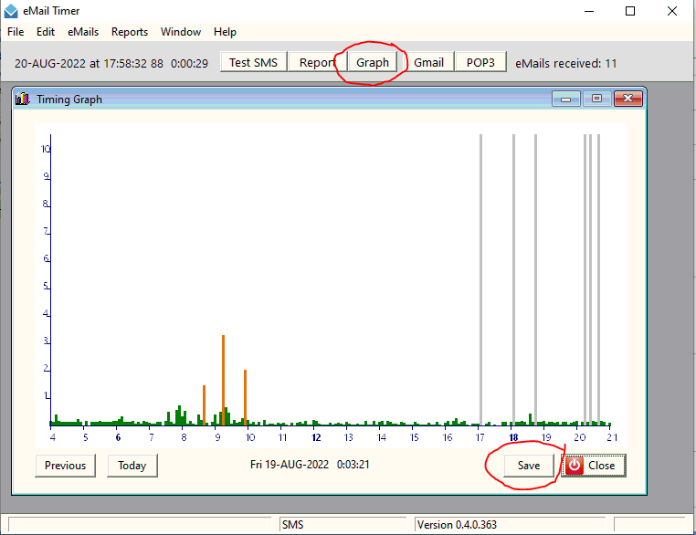 Click on the “Graph” button on the main toolbar. This opens the “GraphWindow” window (shown here). Then I click on the “Today” button to get the data for today (It normally shows yesterday’s data because today’s data is incomplete before 9pm) and then the “Save” button, followed by “Close”.