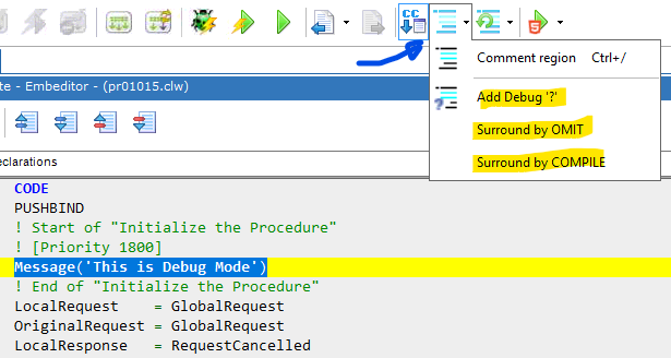 The C8-C11 Editor has a Comment button on the Toolbar. The Drop list of that can wrap the Selected code in an OMIT or COMPILE, or can prefix the lines with “?” for Debug: