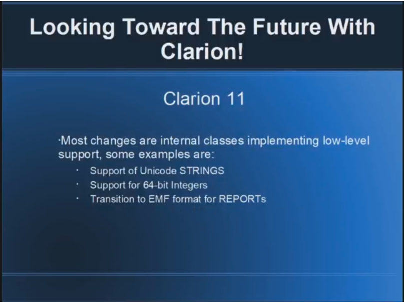 The new classes combined with all of the work in the Scanner/Compiler/Linker are the base for the evolution of Clarion for many years ahead.