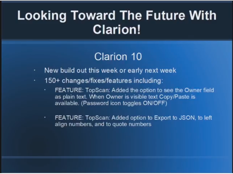To me the JSON generator he mentioned is just a sideshow for current Clarion developers, I personally can’t see a great need for it as an alternative to existing Clarion methods for handling JSON data.