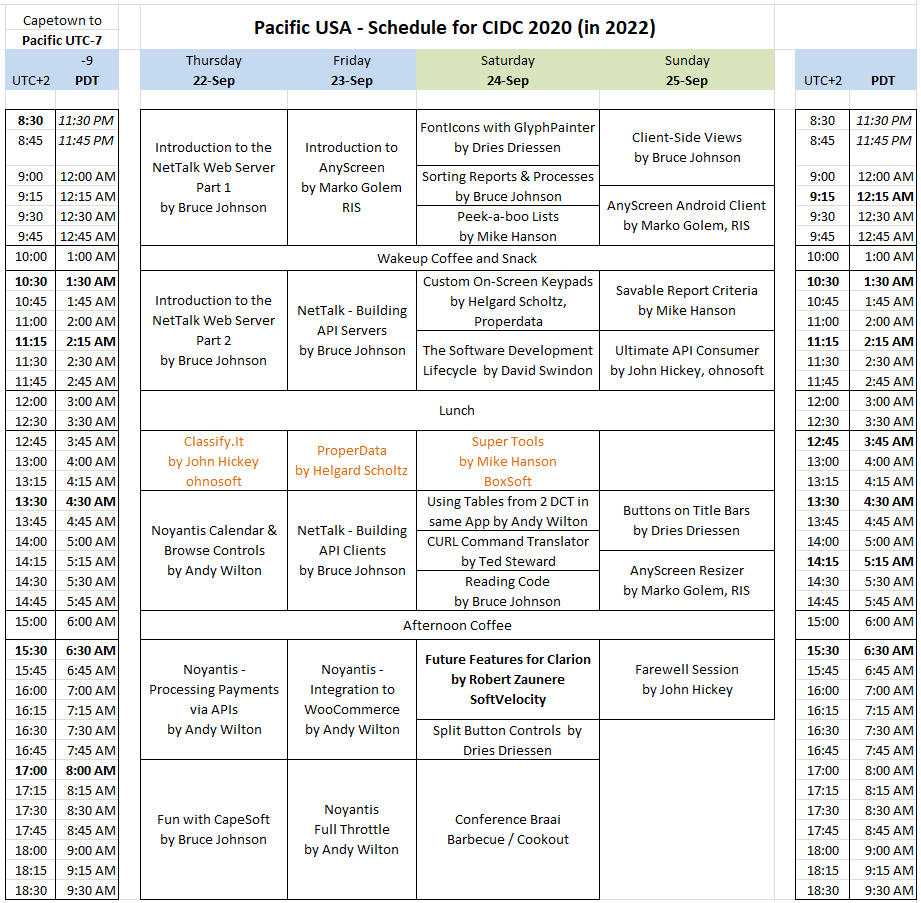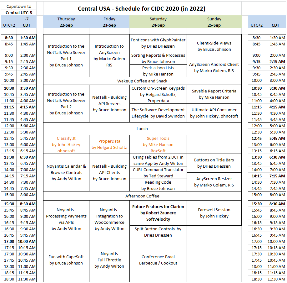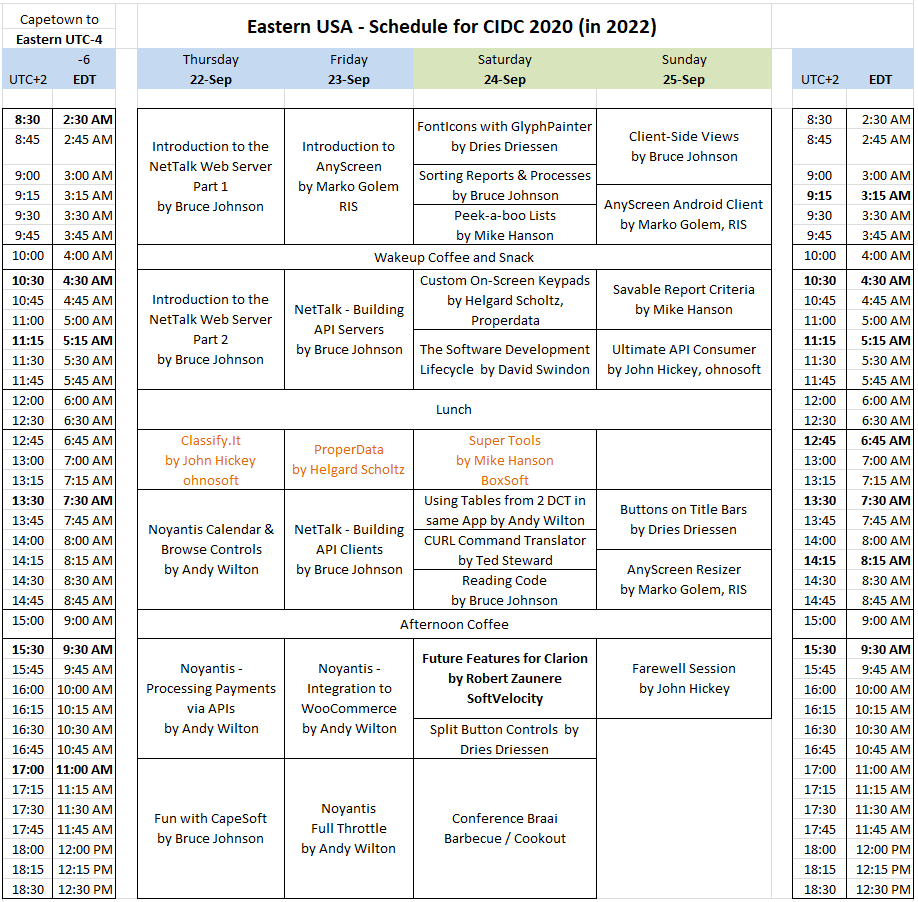 The above schedule is kind of terse without the tool tips and popup windows that appear on the website. Below I made more detailed Excel sheets. These XLS are in the CIDC_2020_Schedule2.zip attached to the prior post. You can use them adjust to your time zone, highlight important sessions, keep notes, etc.
