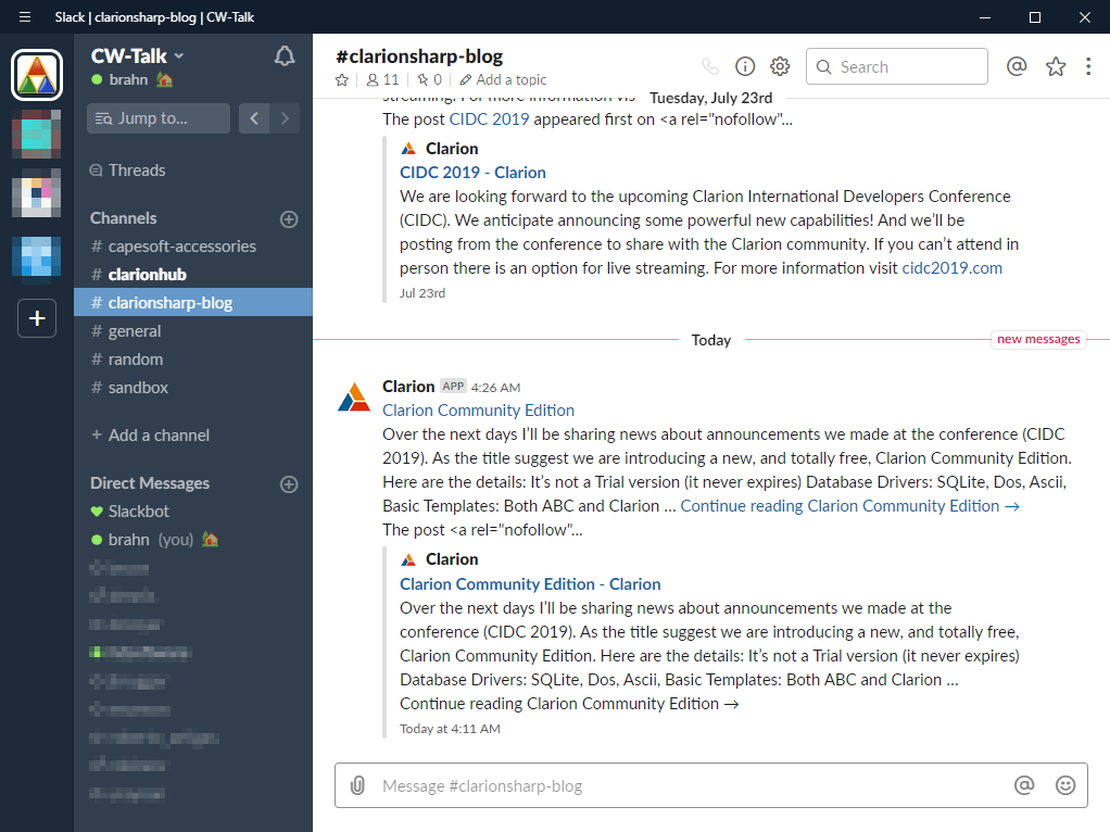 I connected the clarionsharp.com RSS feed to the CW-Talk slack account so I can abuse slack as an RSS reader ![]()