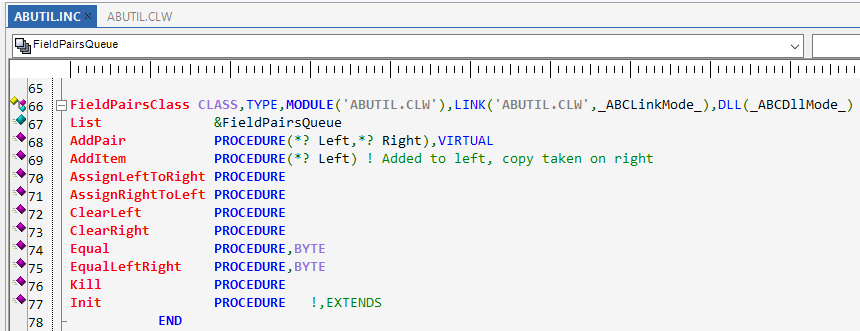 Note the Return value is not in the CLW. Its just the way the syntax works. Probably because it does not affect the “Procedure Signature” that makes it unique for overloading. It is somewhat of an annoyance as often I copy/paste that line and forget to remove the return type.