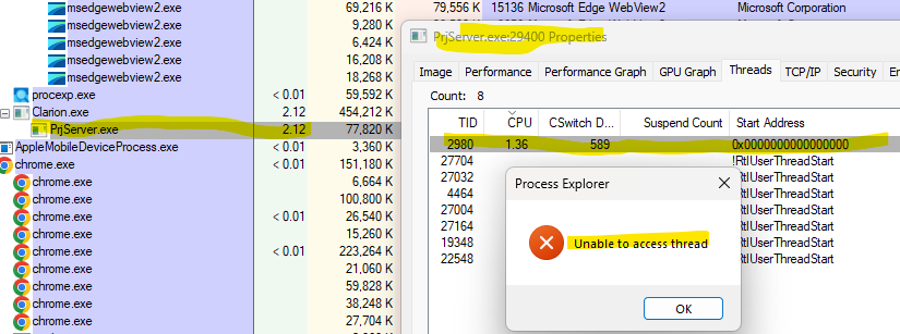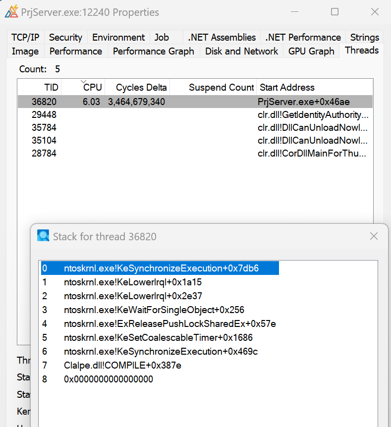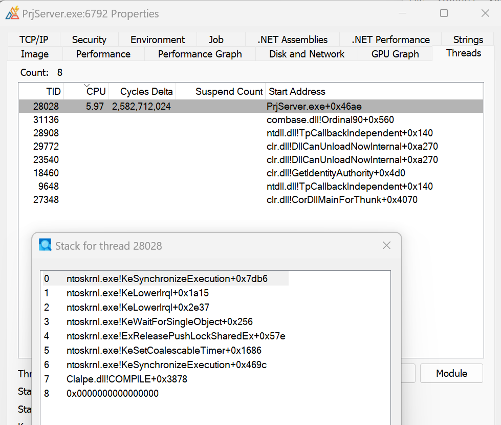 Is there some sufficient (about 100% / number of processor’s cores) CPU usage? If yes, you can use the Process Explorer to determine the thread that eats the CPU: right click on the line with Clarion.exe or PrjServer.exe depending from which is showing CPU usage and select the Properties… item. In the process properties window choose the Threads tab. Select the thread with