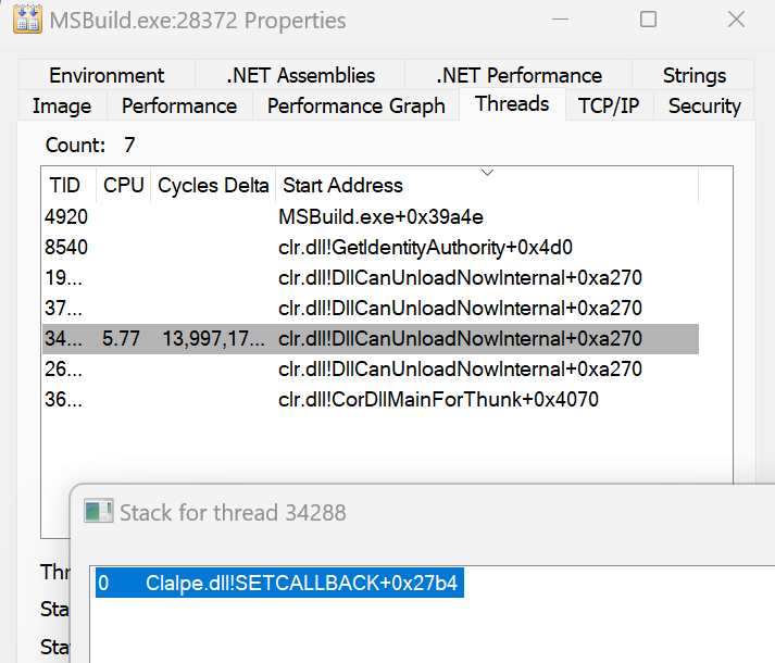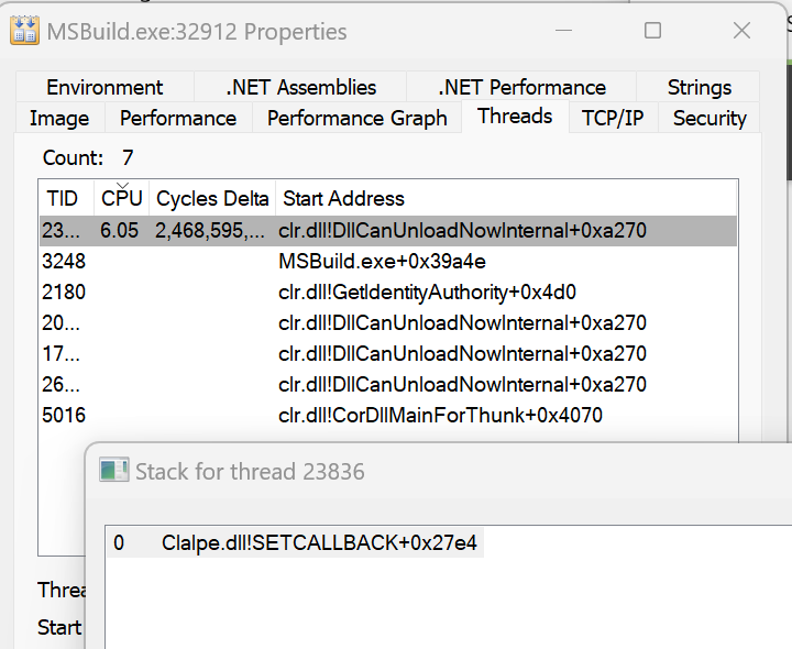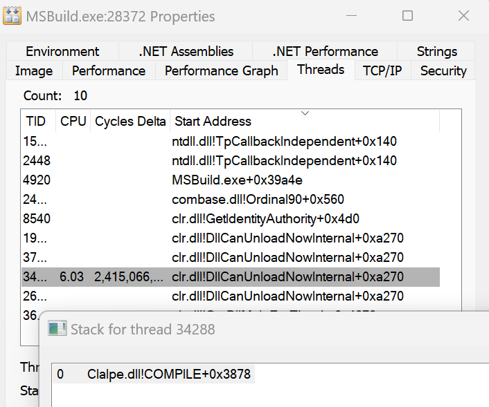 I re-ran my command line MSBuild and this time, the MSBuild process seems to be jumping about between clalpe.dll!COMPILE 0x3878, and clalpe.dll!COMPILE 0x387F and the previously discussed CALLBACK offset.