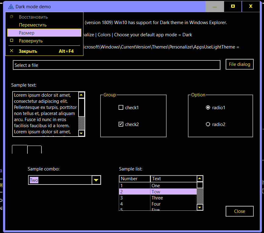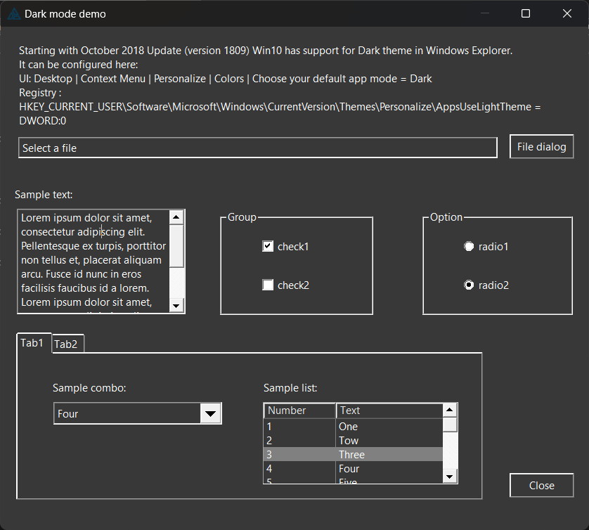 I have this Sheet Tab example you could try your OS Dark Theme with most Sheet/Tab options. I would think some will not work without NoTheme. This also shows a lot of control types (Button, Check, Radio, Spin, Text…) like your example.