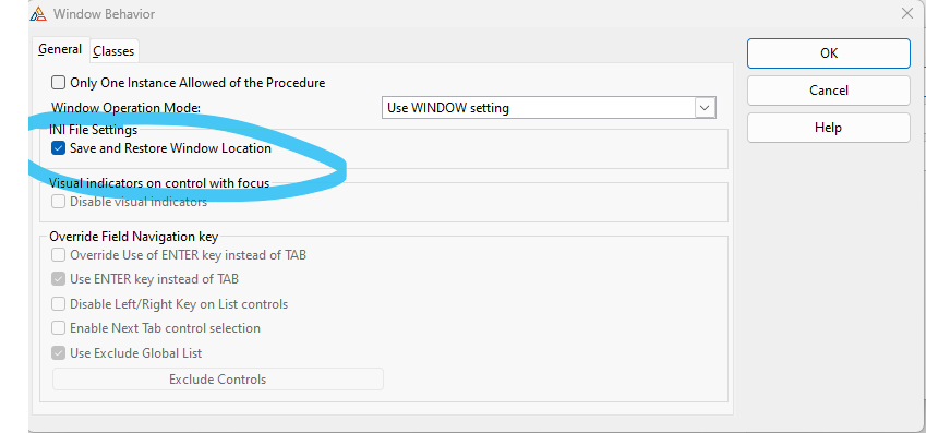 but still my compiled program store and restore windows locations, any ideas on what to look for, please?