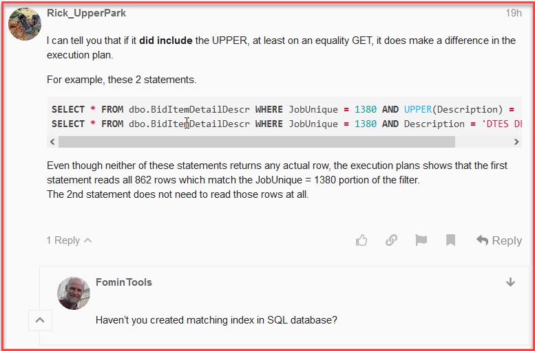 This also is not relevant. Clarion does not use the indexes in the actual database for SQL. Clarion just used the columns from your table definition to include the columns in the statements for where or order by clauses. The SQL engine determines which indexes to use or not to execute the statement.
