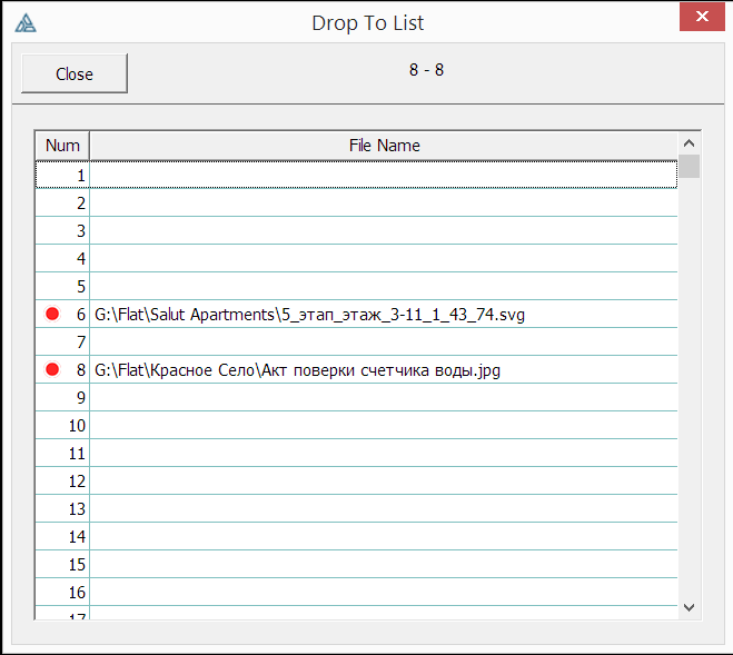 Below is the screenshot of the program to test drag-and-drop into a list. The SYSTEM{PROP:CharSet} has value CHARSET:Cyrillic :