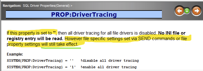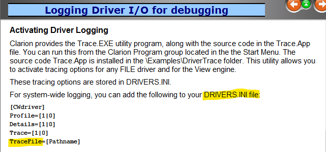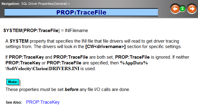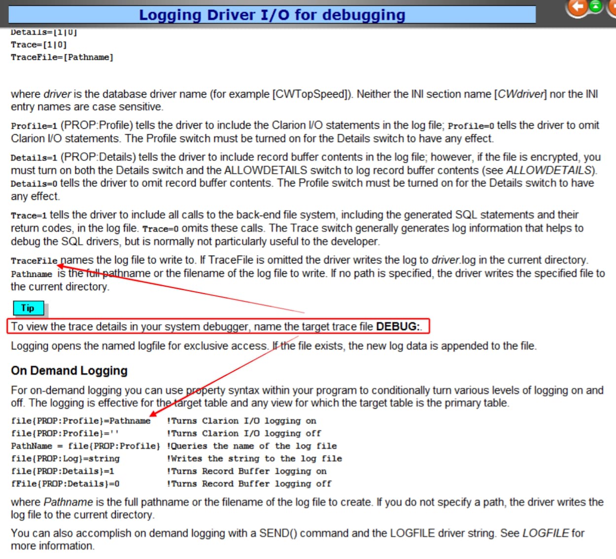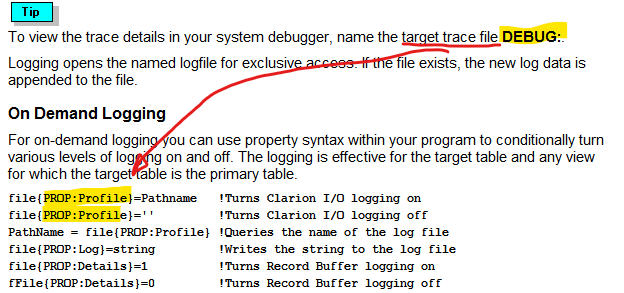 !The use of {PROP:Profile}='DEBUG:' is not well documented appearing only in topic "Debugging your SQL application"