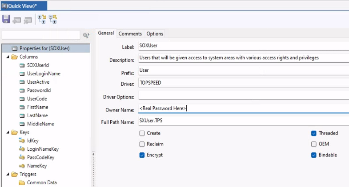 SOXUser FILE,DRIVER(âTOPSPEEDâ),OWNER(ââ),ENCRYPT,NAME(âSXUser.TPSâ),PRE(User),BINDABLE,THREAD ! Users that will be given access to system areas with various access rights and privileges