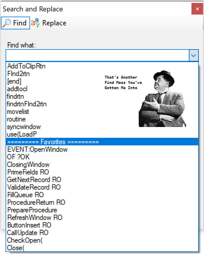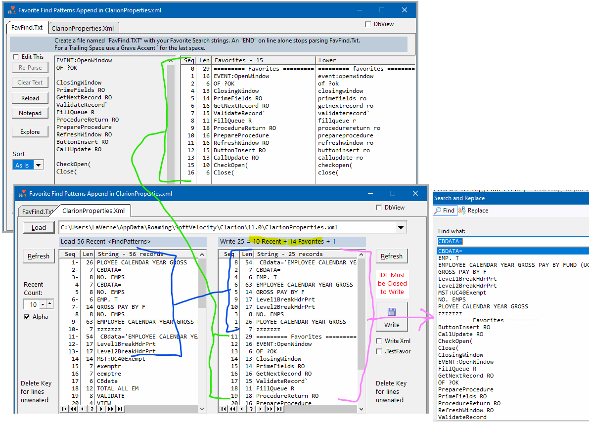 The FindCleanCwIDE tool shrunk the large FindPatterns value to fix a few problems. This tool adds your favorite strings to the end of the drop list so you can use them.
