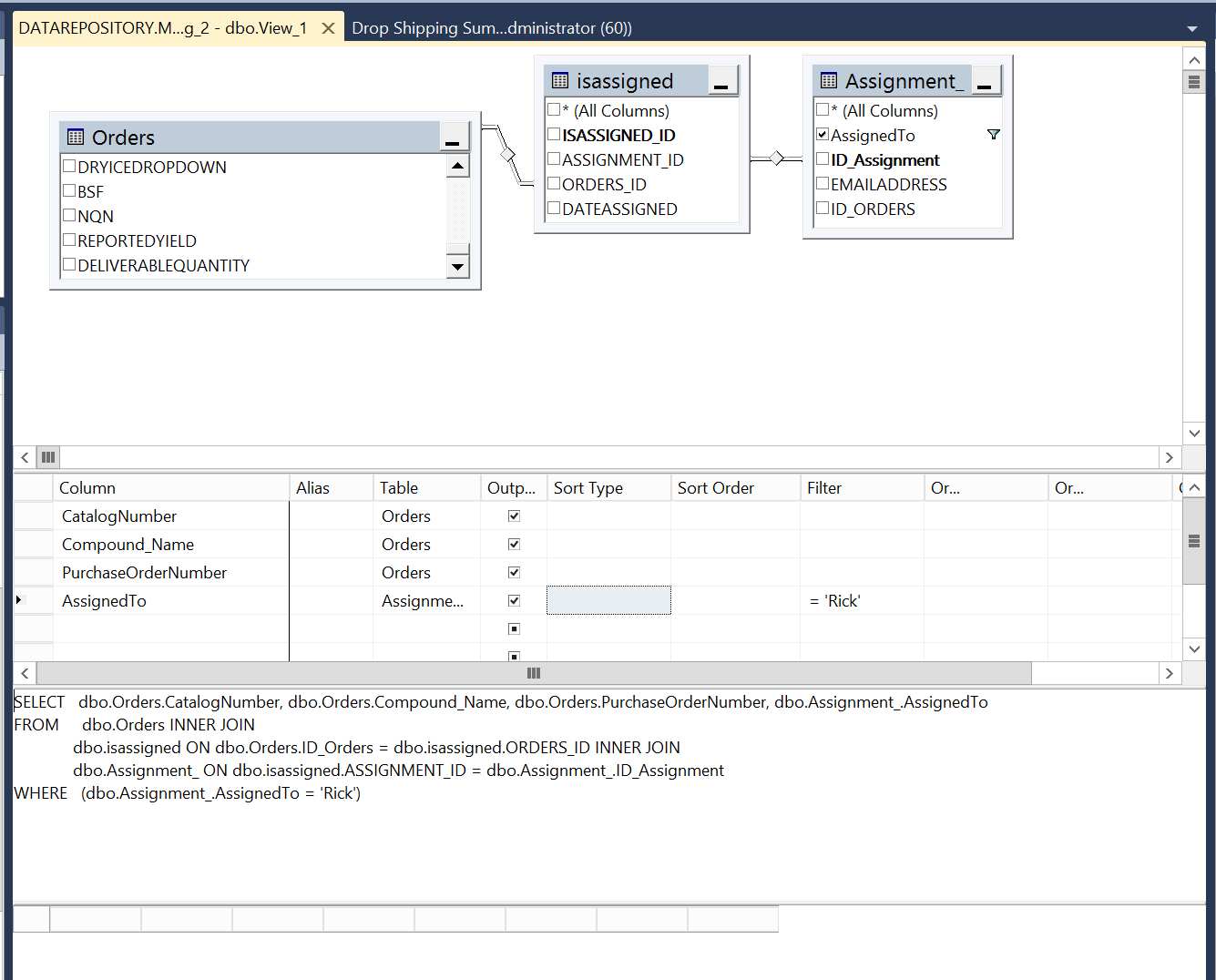 SELECT dbo.Orders.CatalogNumber, dbo.Orders.Compound_Name, dbo.Orders.PurchaseOrderNumber, dbo.Assignment_.AssignedTo