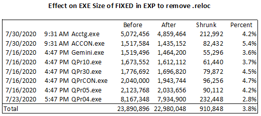 In your EXE Global Embed “Creating the Export file” add a line with just “FIXED” and the Linker will not generate a Relocation section (.reloc) making the EXE smaller. The link will probably run a tiny bit faster. The EXE is loaded first and is never** relocated. Do NOT use for DLLs.