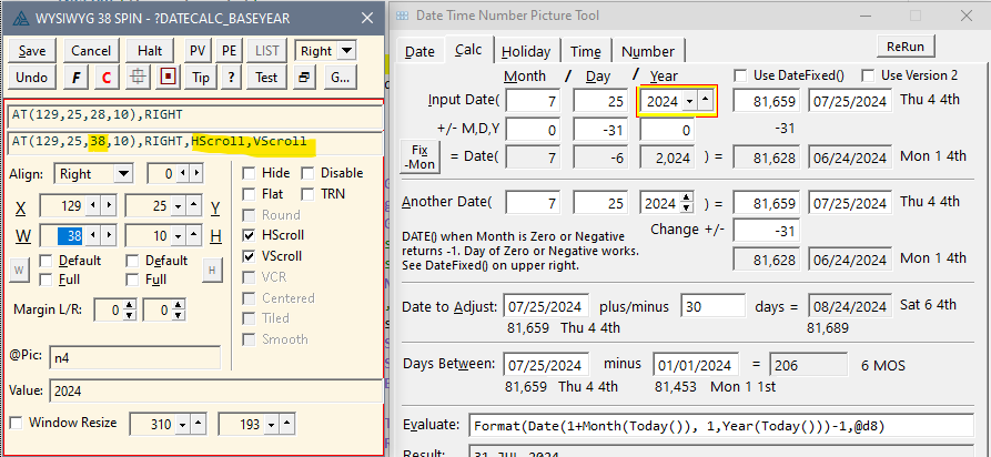 The IDE Window Designer is good but not 100% accurate. Things like SPIN() controls are way off if you are trying to fit controls tightly like below changing a SPIN to use HVScroll buttons needs Width to change from 28 to 38. Compare to the default stacked buttons used on the Year of āAnother Dateā down below. This from Date Time Tool.