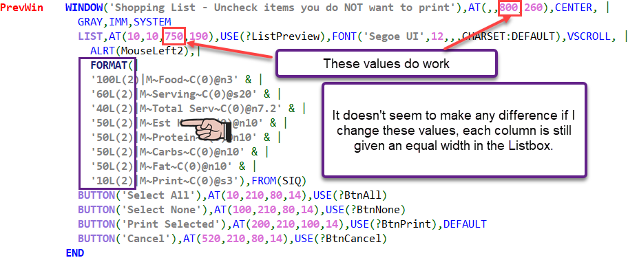 At present, the listbox displayed is quite unimpressive, to say the least. I haven’t been able to properly format it. The headers won’t display and all of the columns have been given an equal amount of space, despite the FORMAT directing it to allocate given amounts of width. Changing the Window AT or the List AT values do change the size(width) of each, but the columns remain evenly distributed no matter the size of the listbox.