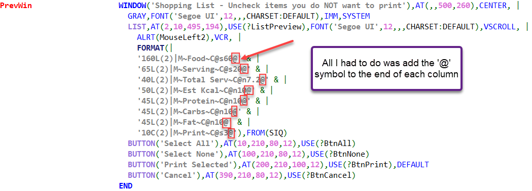 Are you aware that you can press Ctrl-D in the data section of source code and the Clarion window designer will open and you can format your list visually?