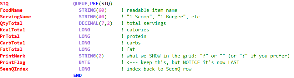 I attempted to add #FIELDS(SIQ:Foodname, etc.) after the FROM(SIQ) attribute but that brought up several errors: