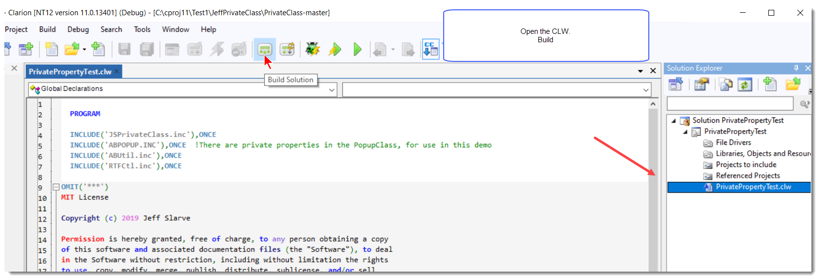 So I just tried File, Open Project or Application, select the PrivatePropertyTest.cwproj, no windows or tabs appear, but I noticed it has the [drive\folder\PrivatePropertyTest] in the IDE window title.