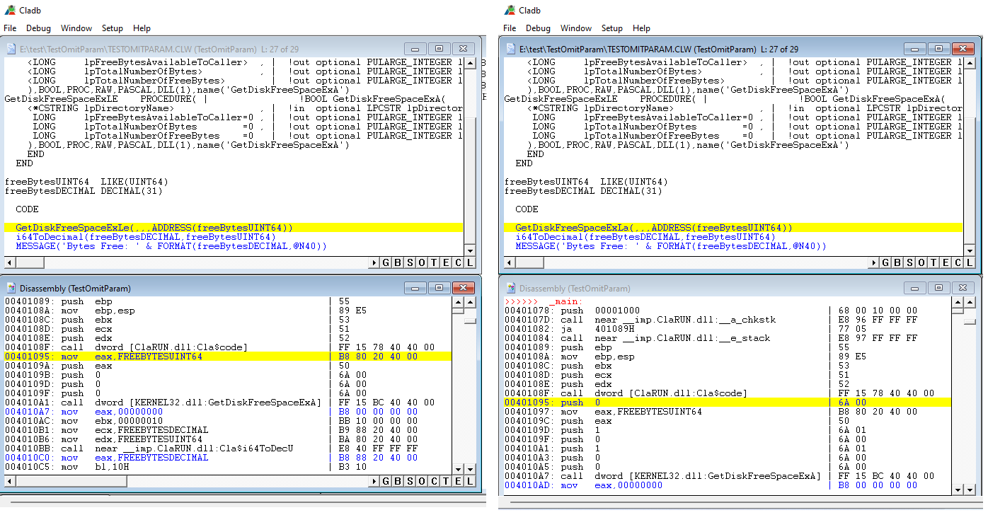Also there is an screen capture of Clarion Debugger where it can be seen the extra PUSH 1’s to the stack when using <>