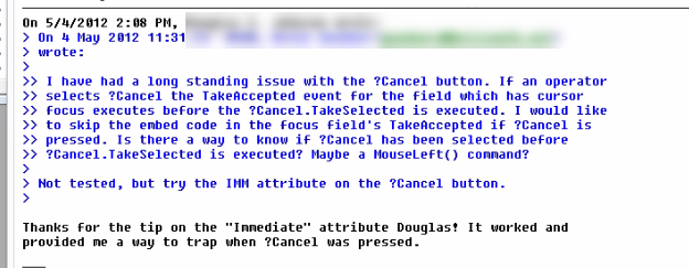 When a the cursor is on a given control field, I would like to skip the control’s TakeAccepted Embed Code when the operator presses with Esc or the ?Cancel button. What should I test for? “Self.Response=RequestCancelled” or something like that?