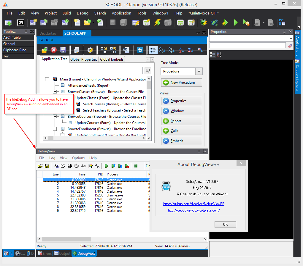 A while ago I created the (free!) IdeDebug addin to assist with various debugging related things. At the time the only real option for monitoring debug output was DebugView from SysInternals. Recently, @MarkGoldberg came accross the really neat DebugView++ and it turns out you can use this as a direct replacement for DebugView to embed debug output monitoring in the IDE using the IdeDebug addin!