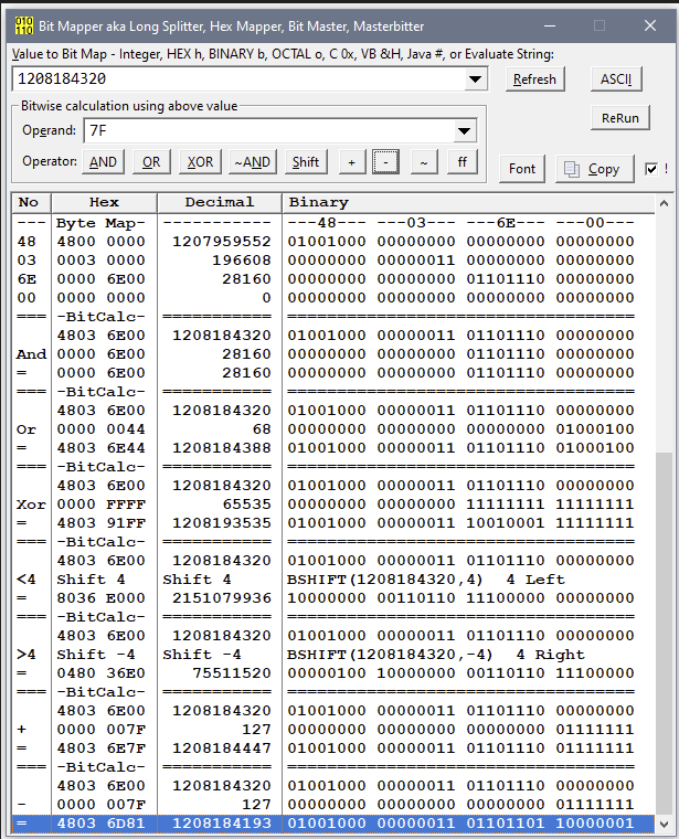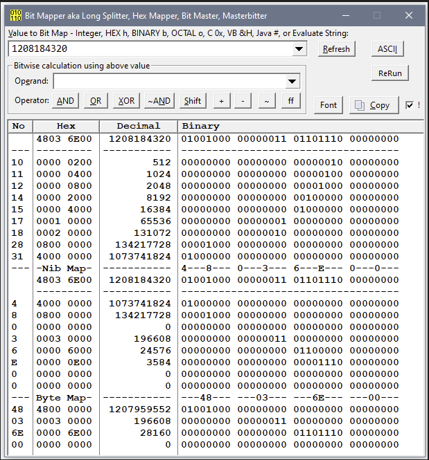 Added on GitHub an old tool Bit Mapper that takes a LONG and shows it split into all the Bits, Nibbles and Bytes.