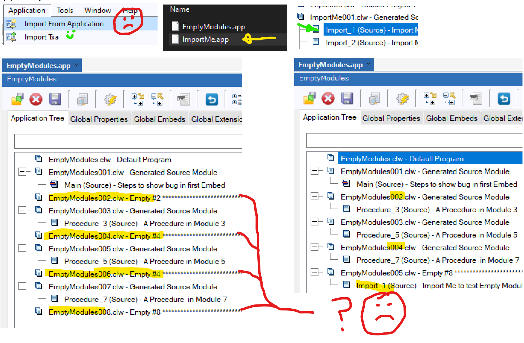 I accused someone of again Deleting Empty Modules and Renumbering. He was sure he didn’t and its hard to image doing both and not recalling. He did recall doing an Import from Application. I tested and it does in fact Delete Empty and Renumber. Here is a screen cap from a bug report showing before/after import the modules gone.