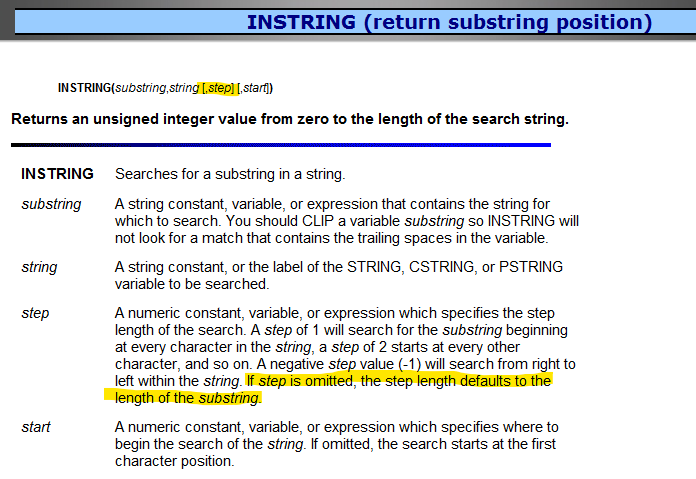 Not that you asked … AFAIK if you use a Negative Step of -1 you must specify the 4th parameter “Start” as the end of the string or it will not work. IIRC it used to be limited to 255, that may have been fixed.