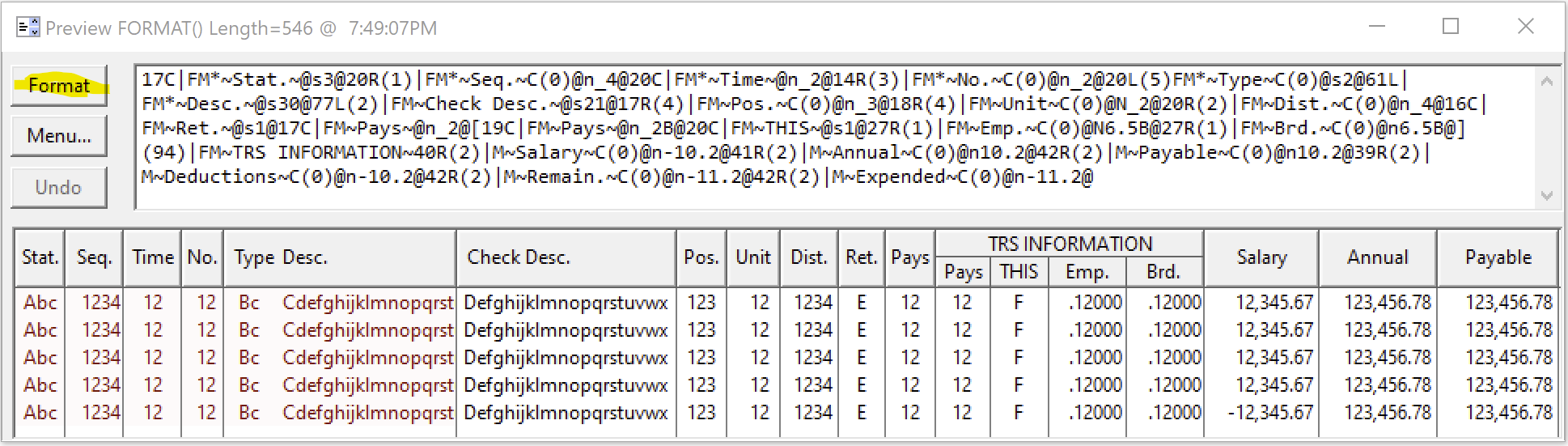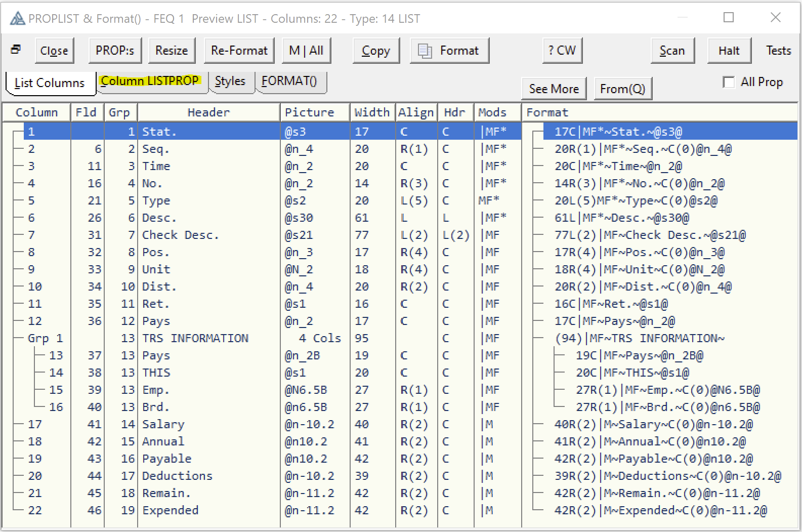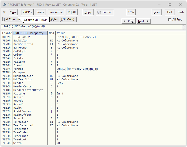 You can change individual columns using { PROPLIST:xxxxx, Column# } properties e.g. {PROPLIST:Header,1}=‘New Col 1 header’ which is Format() ~Header~. To change Queue field number assigned to a Column use PROPLIST:FieldNo,Col}=1 which is Format() #1#.