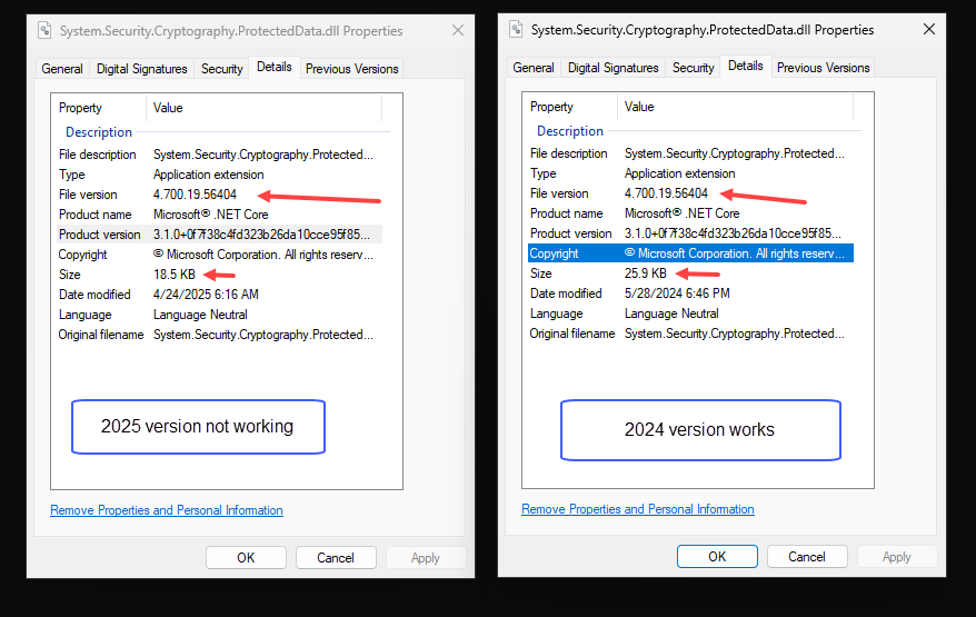 If I swap the System.Security.Cryptography.ProtectedData.dll from my old version, the new version works… but requires a web sign-in to my Azure account each time.