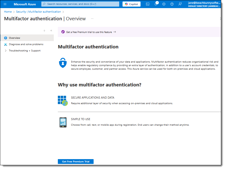 As for MFA, I just checked the page with my admin Azure account and get the “in app purchase” screen