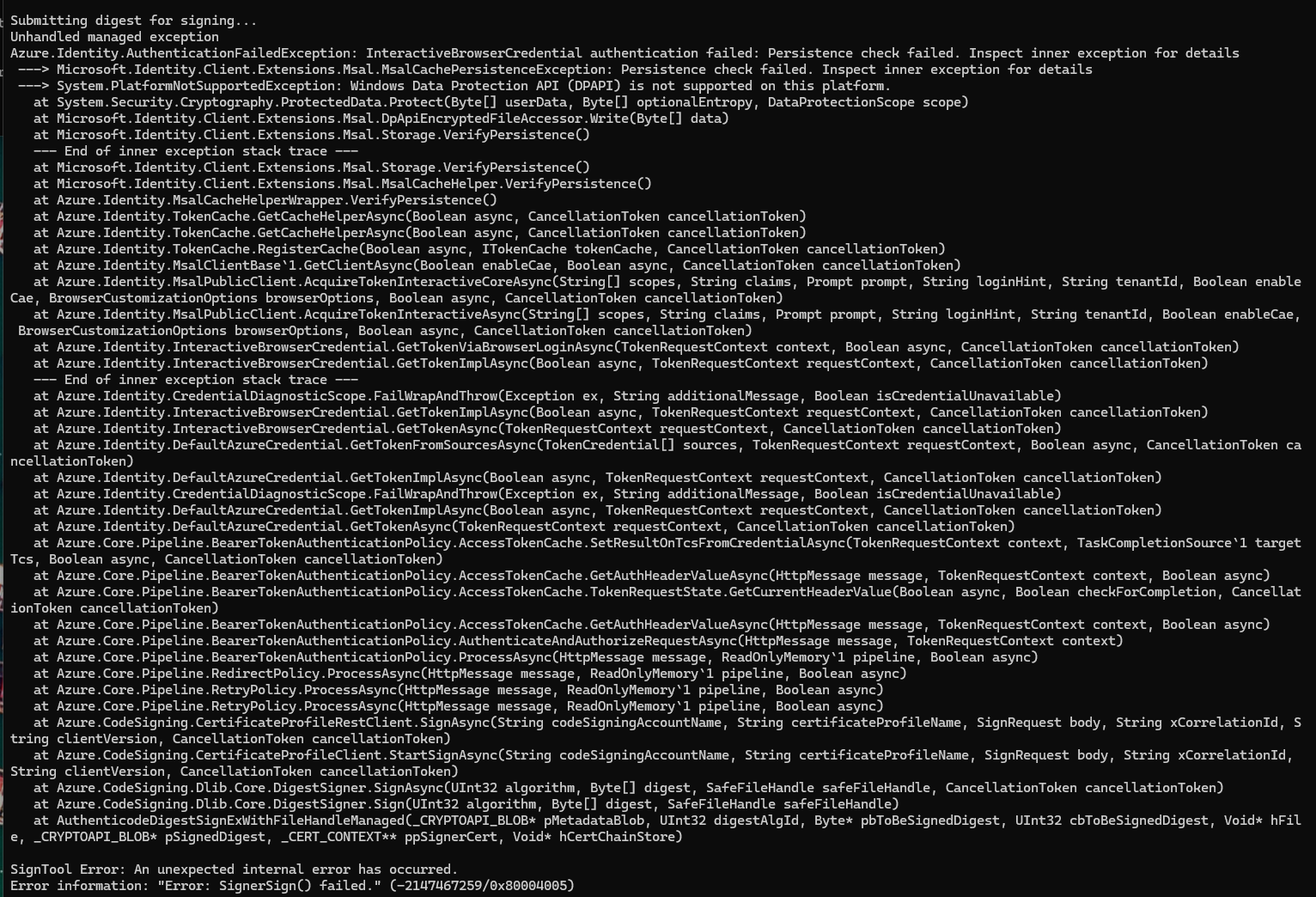 which led me to this link: Exception: "Windows Data Protection API (DPAPI) is not supported on this platform." using Microsoft.Trusted.Signing.Client 1.0.76 - Microsoft Q&A