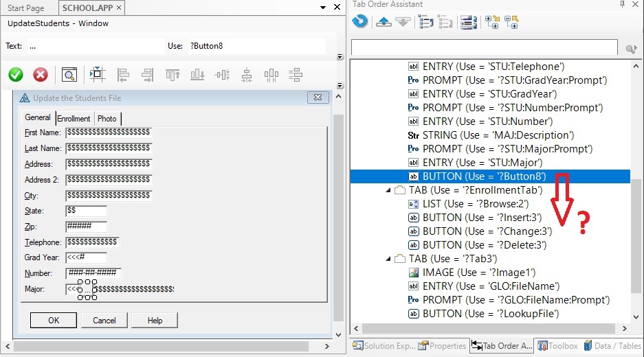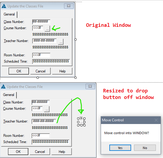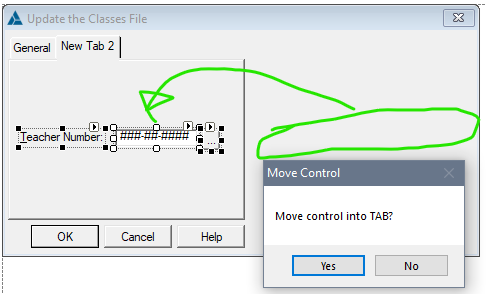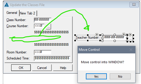 A Message will ask “Move control into WINDOW?”. Answer YES which moves the control on the Tab Order.