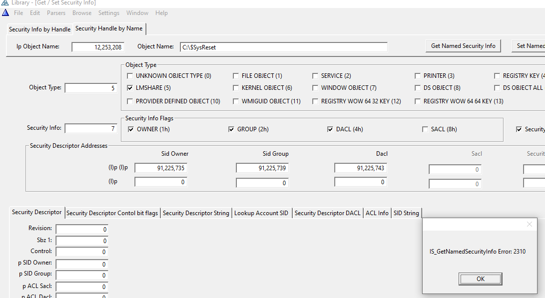 Other attack vectors on a windows machine include its registry, which I havent tried yet, but these screen shots document the errors I get when attempting to connect to different things using a C11 app and the GetNamedSecurityInfoA api.