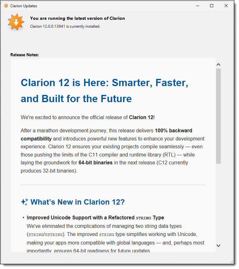 New Blog is up: https://clarionsharp.com/blog/clarion-12-beta-ustring-returns-ansi-unicode/
